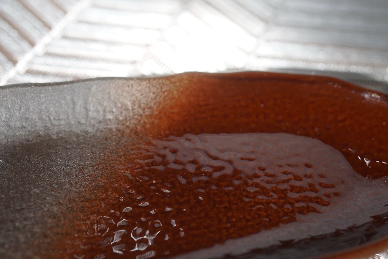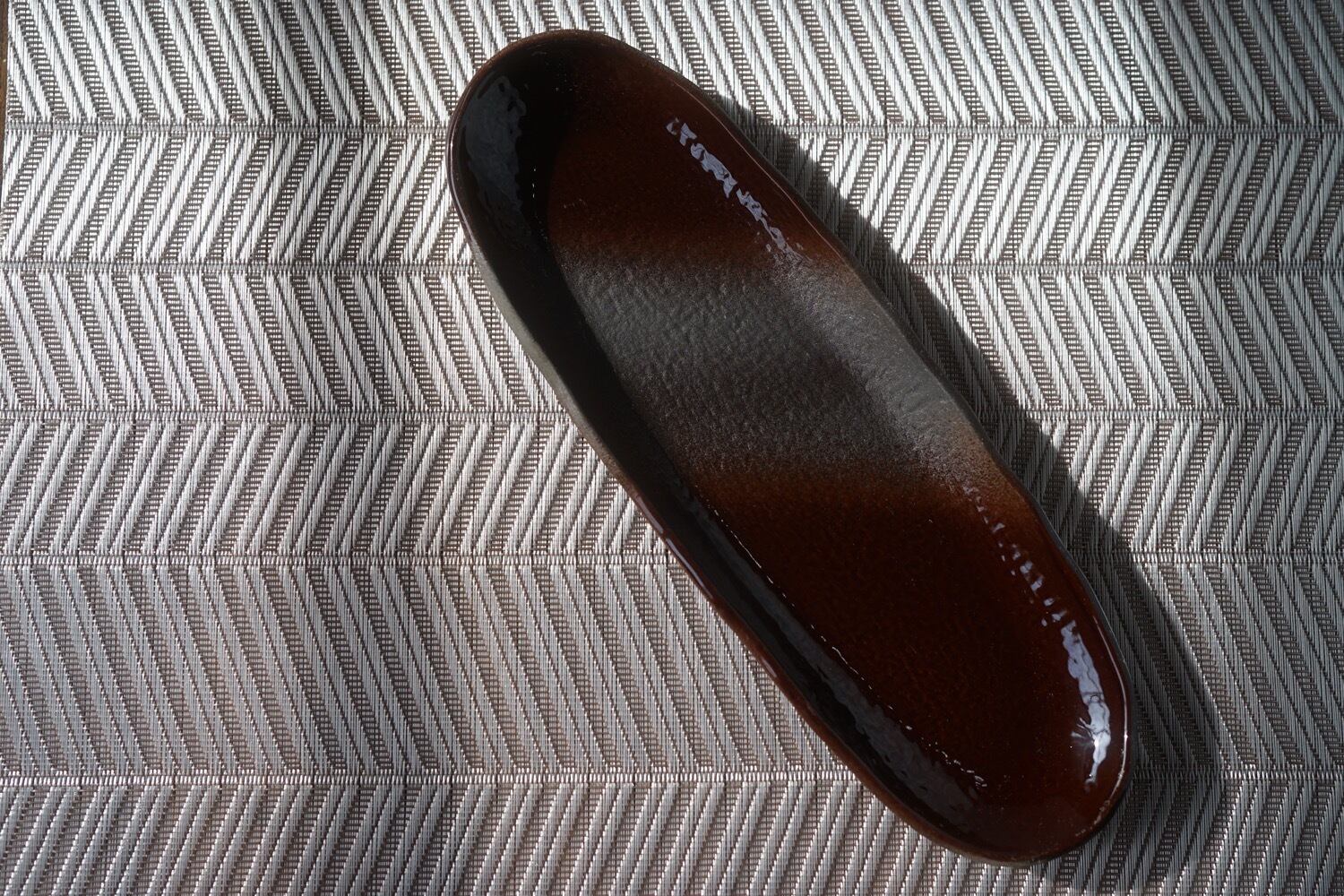 本商品は、落ち着いた灰釉の色合いを持つ小判形状の突き出し皿で、横幅約27cm、奥行き約9cm、高さ約1.5cmの絶妙なサイズ感が魅力です。シンプルなデザインは、さまざまな料理と調和し、盛り付けの楽しみを広げてくれます。おしゃれな食卓を演出するためのアイテムとしても重宝します。